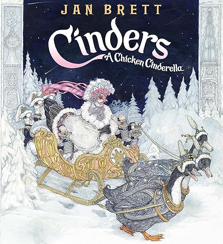 Jan Brett sets her Cinderella story in a snowy Russian winter where one magical night, Cinders, the most picked upon hen in the flock, becomes the most loved by Prince Cockerel when she arrives at his ball looking so beautiful that even her bossy sisters don't recognize her. Jan travelled to Russia and readers will be in awe of the Ice Palace aglow under a deep blue moonlit sky, exquisite ball gowns on the comely pullets, uniforms with gold braids and buttons on the cockerels, striking Russian architecture transformed into ice in the borders, and a very funny flock of chickens who provide an appealing, original look at this snowy Cinderella. Readers will find these dressed up chickens comical as they pour over the extravagant setting, including a "WOW"-inducing double gatefold of chicken couples whirling around the ballroom. A feast for the eyes sure to become a perennial favorite.